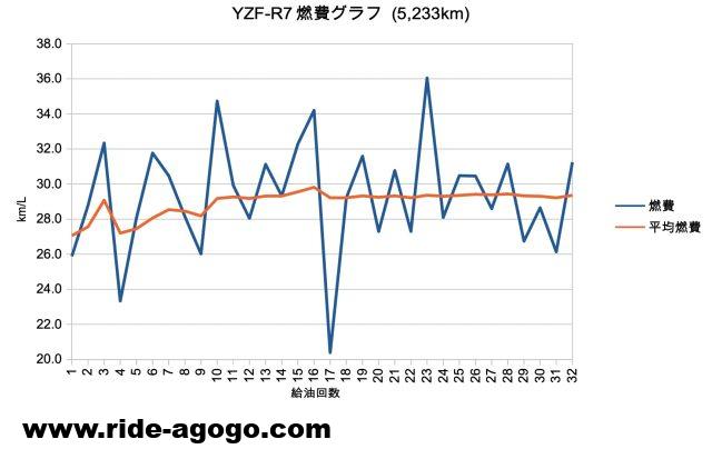 YZF-R7を5,233kmほど走ってリッター29.4kmとなって、残念ですが総平均はリッター30kmを超えることはできませんでした。