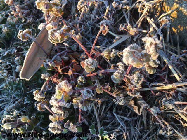 畑には草が生えてますが、一面の霜でした。寒かった。