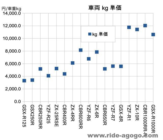 こちらも同様に廉価機種のCBR650R、YZF-R7、GSX-8Rが正比例の関係から外れていて、1,000ccスーパースポーツが1kgあたり12,000円前後で一番高いお肉になってます。