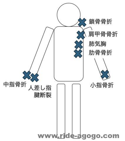 骨折6本、腱断裂1本、肺の空気漏れ、以上が負傷概要です。